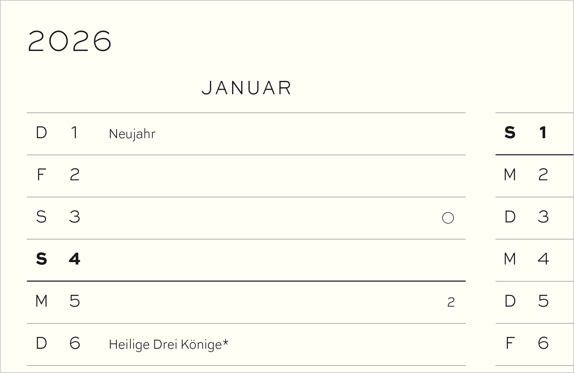 Alle unsere Kalender enthalten Jahresübersichten, die auch das vorherige und das nachfolgende Jahr abdecken. Die wichtigsten Termine und Ereignisse eines Monats auf einer Doppelseite. Dies sorgt jederzeit für den schnellen Überblick und gibt mehr Raum auf anderen Seiten.