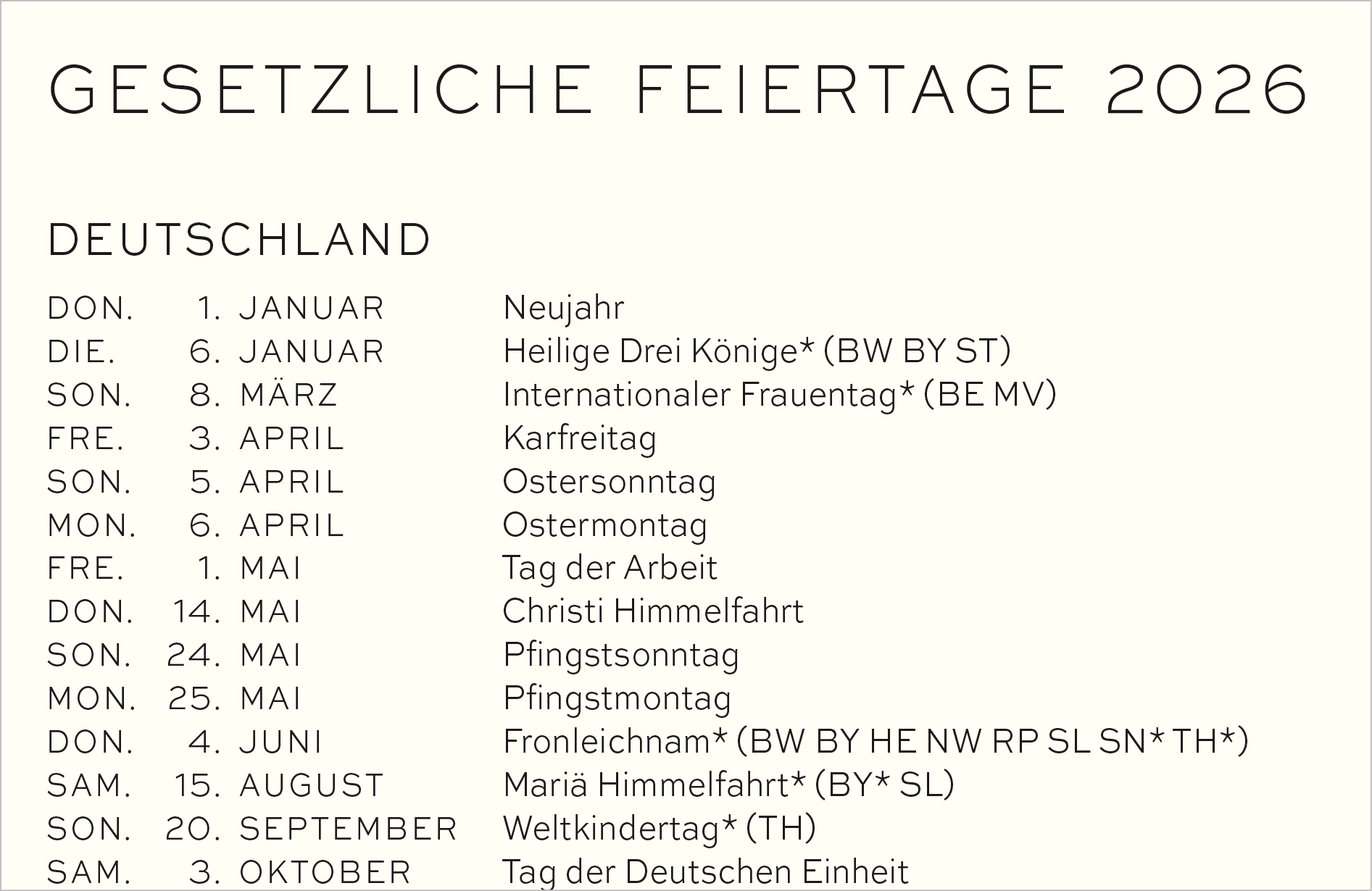 In unseren deutschsprachigen Kalendermodellen sind die gesetzlichen Feiertage in Deutschland, Österreich und der Schweiz sowie die deutschen Schulferientermine in Übersichten dargestellt. Zusätzlich werden internationale Feiertage aus insgesamt 58 Ländern auf einer Doppelseite abgebildet.