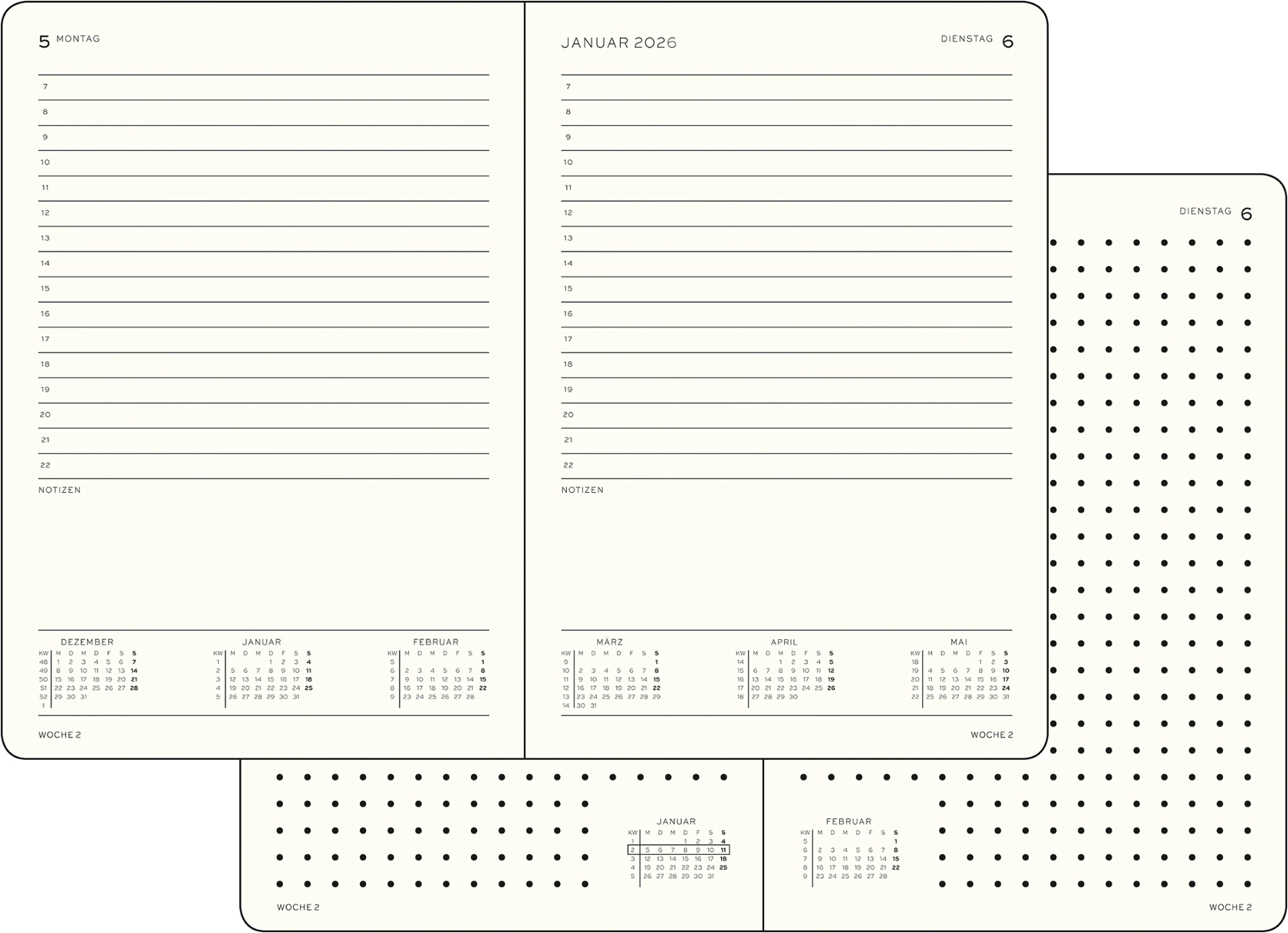 Die Ansprüche an einen Kalender sind so unterschiedlich wie die Vorlieben und Routinen im Leben. Daher haben wir fünf verschiedene Kalendermodelle entwickelt, die der persönlichen Vorstellung von Planung, Organisation und Ideensammlung entsprechen.