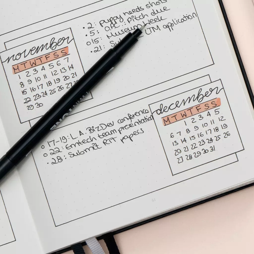 • Erhältlich in Schwarz, Blush, Blue22 oder Green23 mit Blindprägung "Bullet Journal"
