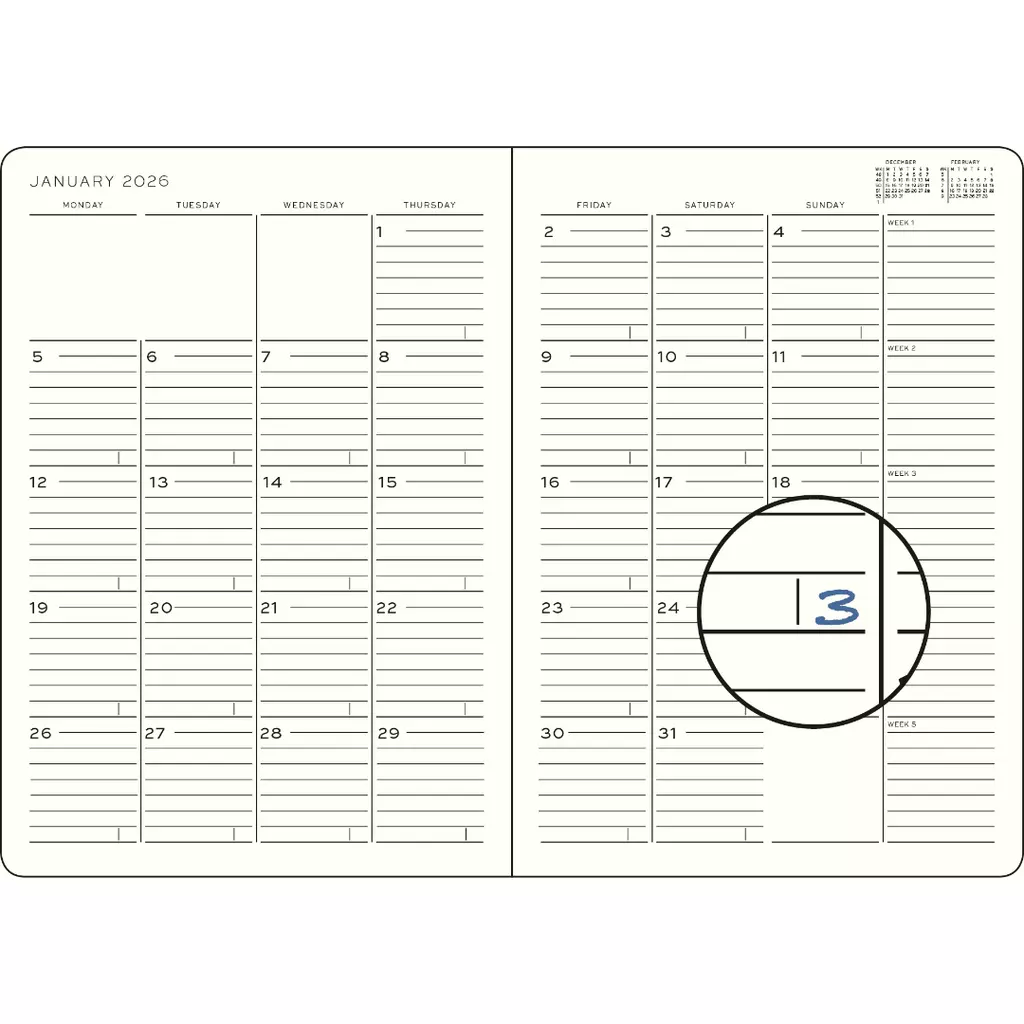 • Kalenderseiten B5 mit Linien; Kalenderseiten B6+ ohne Linien