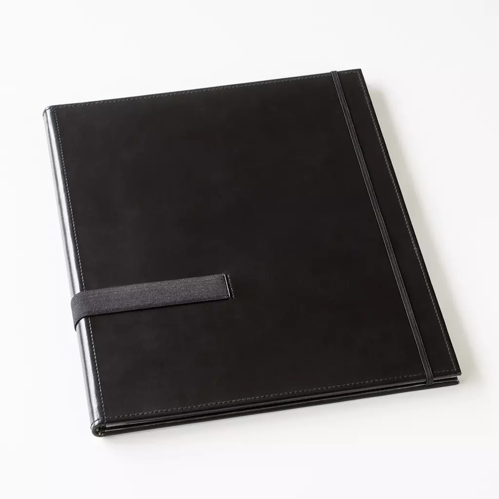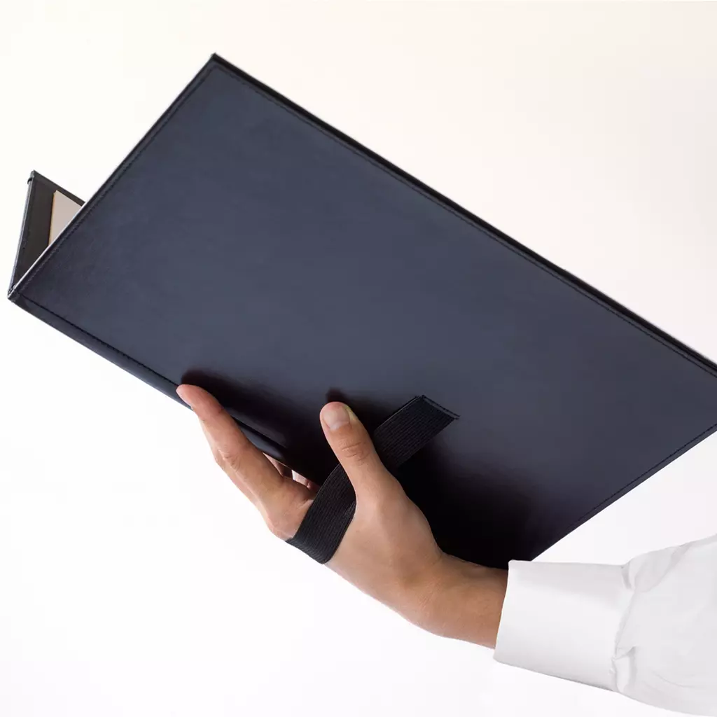 Mit einem zusätzlichen soliden elastischen Band am Rücken. Einfach die Hand hineinschieben, und schon kann man die Mappe, z. B. im Chor oder vor Publikum sicher mit einer einzigen Hand halten und hat die andere zum Blättern frei.